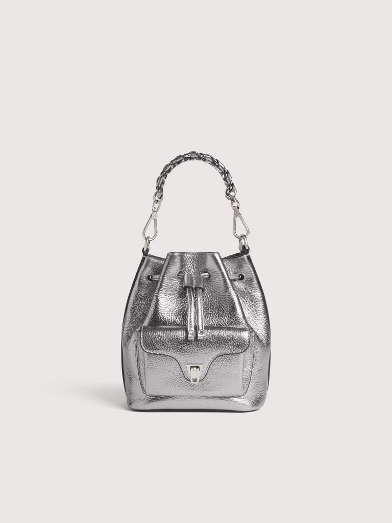Il design a secchiello di questa borsa è arricchito da un manico in pelle e catena, un mix perfetto di materiali che esprime un’eleganza sofisticata ma mai troppo formale. Il manico in catena offre una dimensione più audace, mentre la pelle lavorata dona una sensazione di morbidezza e resistenza.