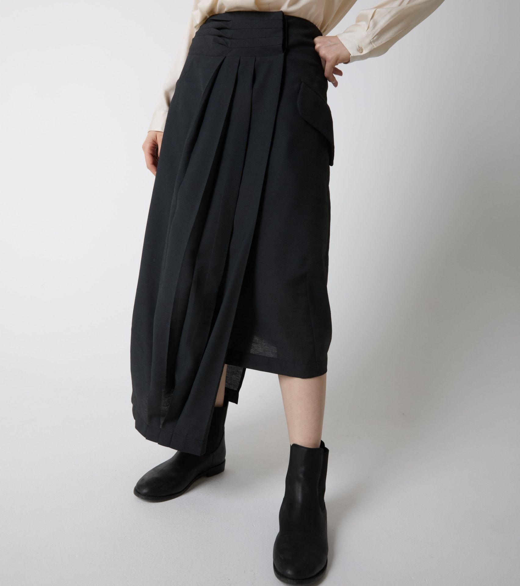 Acquista ora la tua gonna fluida con design asimmetrico e pieghe sartoriali, ideale per look autunnali e invernali eleganti e moderni.
