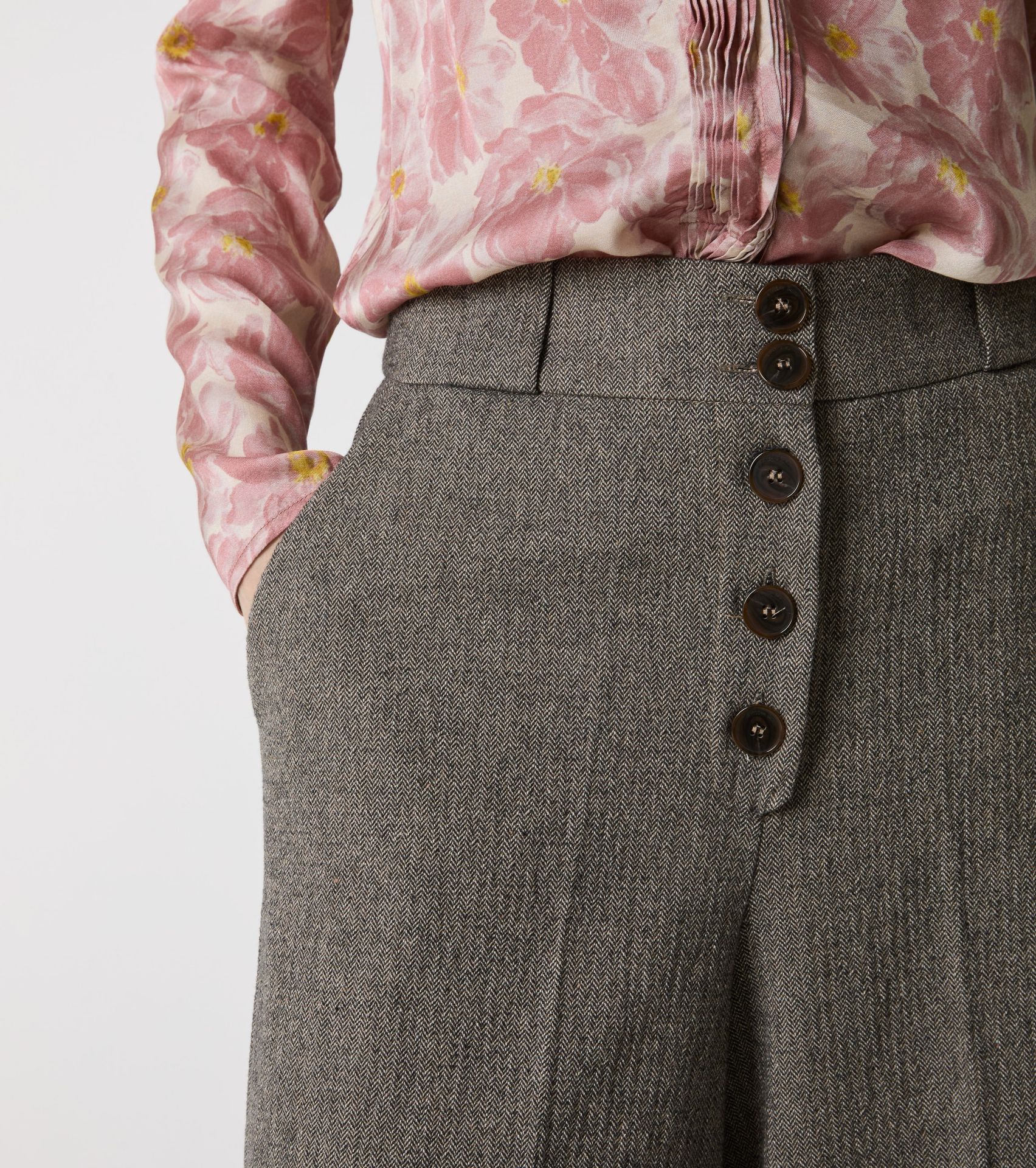 Il modello presenta una linea ampia con piega stirata, tasche sui fianchi e risvolto sul fondo, dettagli che aggiungono un tocco sofisticato e versatile. Perfetti per creare outfit eleganti da ufficio o look raffinati per eventi e tempo libero.
