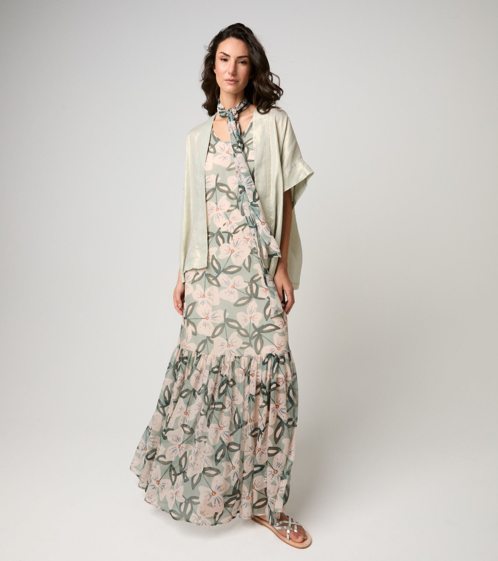 Abito lungo donna salvia – Misto seta con stampa floreale