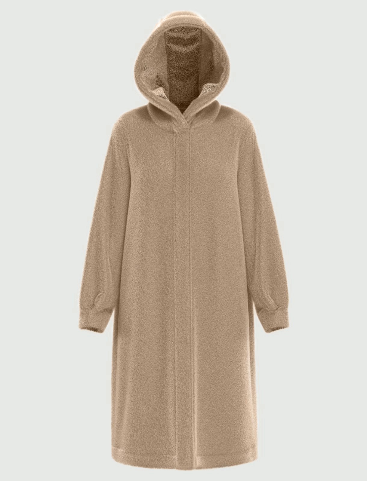 Il cappotto è realizzato con materiali di qualità che garantiscono comfort termico e resistenza, senza rinunciare alla leggerezza. Il fit dritto valorizza la silhouette femminile con linee pulite e minimali, mentre il cappuccio integrato aggiunge un tocco pratico, perfetto per ripararsi nelle giornate dinamiche.