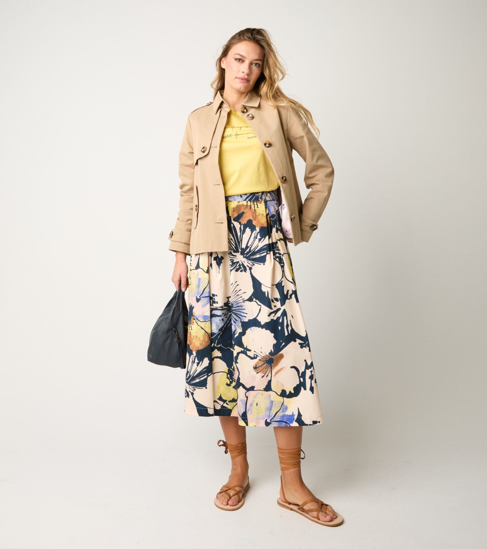 Aggiungi un tocco di freschezza e femminilità al tuo guardaroba con questa gonna longuette donna in popeline di cotone, impreziosita da una vivace stampa floreale. La linea fluida e confortevole, insieme alle delicate pieghe, garantisce movimento elegante e silhouette slanciata, perfetta per outfit primaverili, estivi o casual chic.